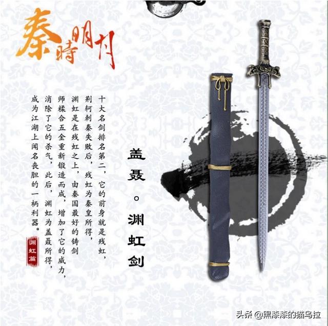 第二名,渊虹,盖聂持有,前身是墨家头领徐夫子的母亲(原型为历史上的男铸剑师徐夫人)打造的残虹剑,为天外神铁所铸,被墨家赠与刺秦的荆轲,荆轲刺秦失败。